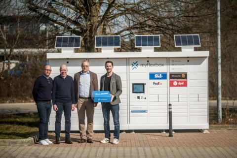 Im Bild v.l.n.r.: Christoph Hofstetter (Vertriebsleiter von Night Star Express Honold GmbH), Thomas Bauer (Geschäftsführer Night Star Express Honold GmbH), Thomas Keßler (Business Development Night Star Express GmbH) Logistik) und Jonathan Grothaus (CEO & Founder von myflexbox) am Standort in der Hochstraße in Traunstein